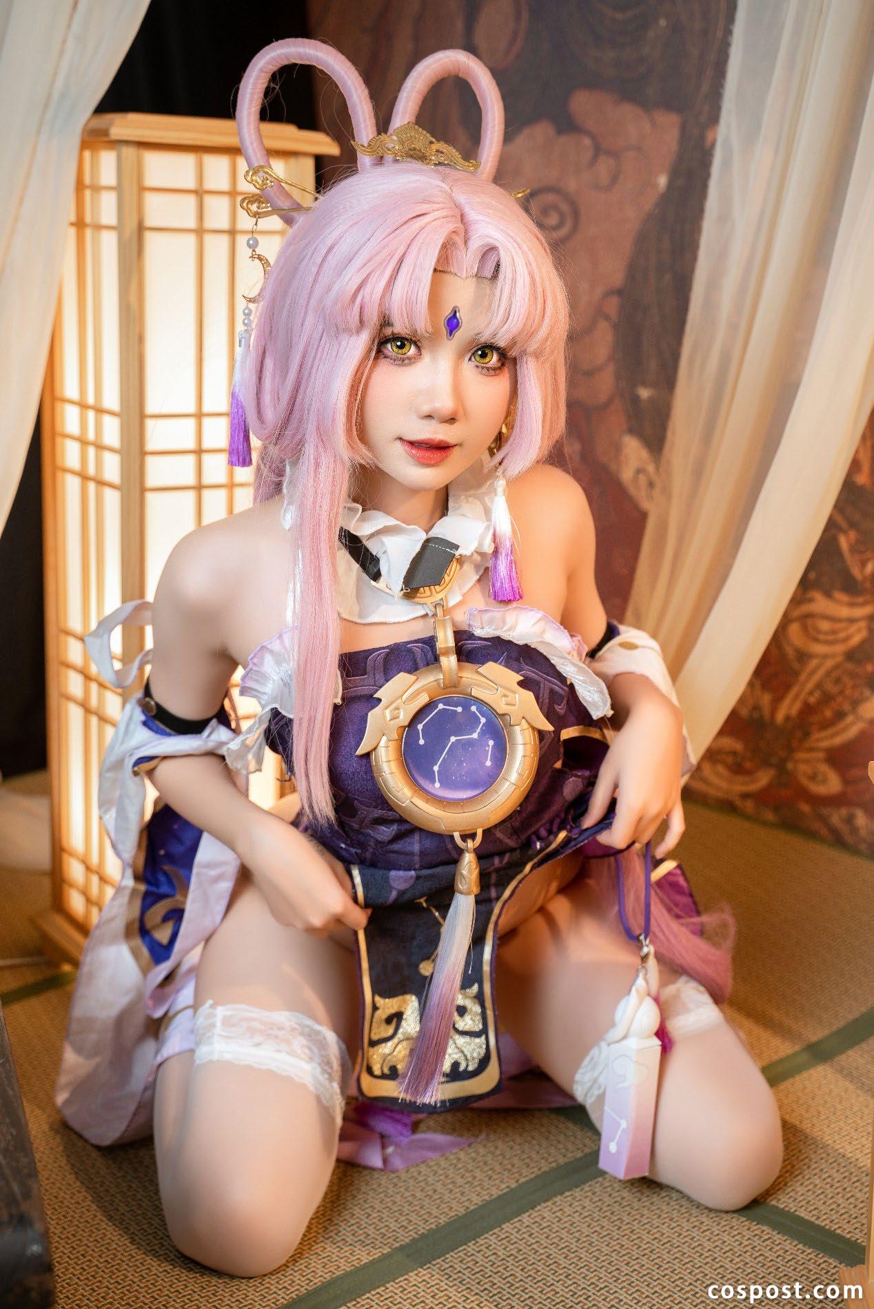 PoppaChan的《Fu Xuan》不止于外形复刻,更精准捕捉了角色“外冷内热、心怀仙舟”的精神内核。她的肢体语言暗藏巧思:站姿挺拔却不僵硬,双肩微沉显露出从容,手持卷轴时指尖轻压卷面的姿态,恰似Fu Xuan推演星象时的专注;眼神处理尤为精妙——不刻意追求“冷艳”,而是通过微蹙的眉峰与沉静的目光,传递出角色“背负仙舟命运的坚毅与通透”。